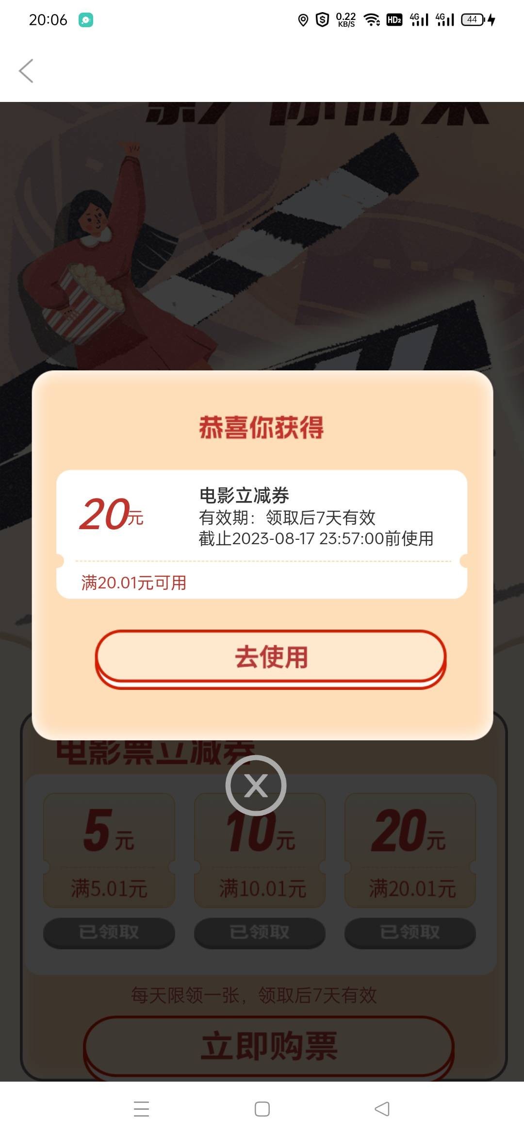 徽商银行电影票20-20补了,可以去看电影