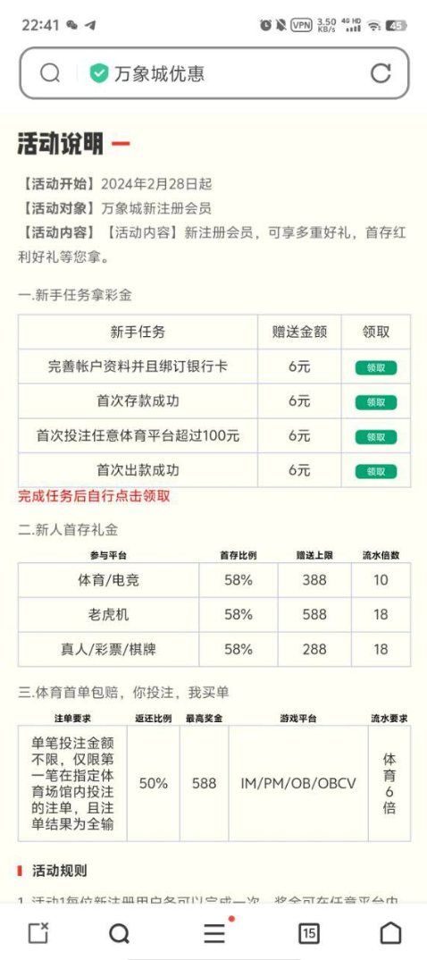注册完善资料绑定银行卡送6.无游戏限制满足100提现。