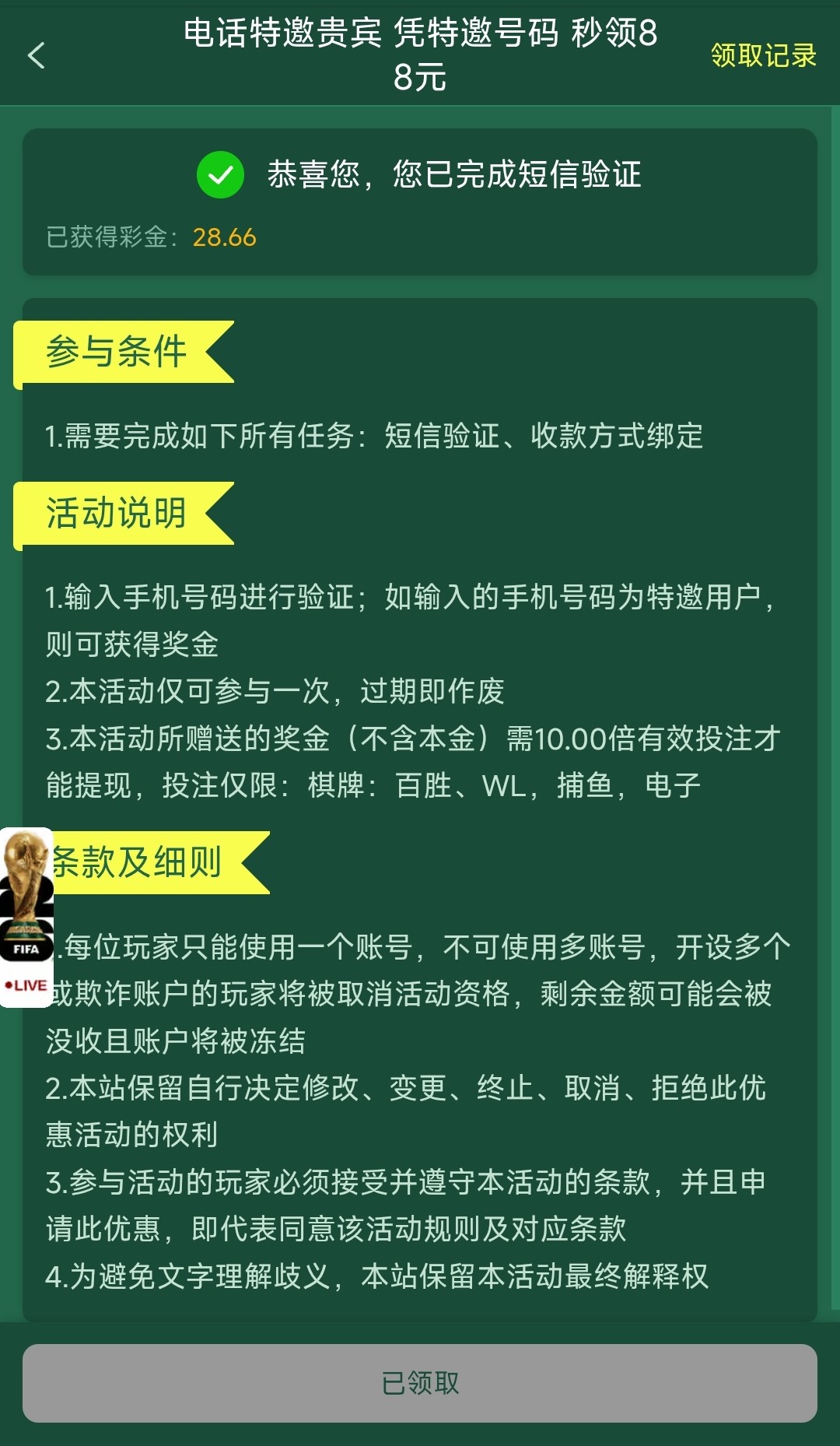 先用手机号注册好绑定收款方式验证手机号在到优惠里找到“电话特邀贵宾”在里面领取,要注册账号才能在优惠里找到这个入口,10倍流水,只能投注电子/捕鱼/棋牌(百胜/WL)