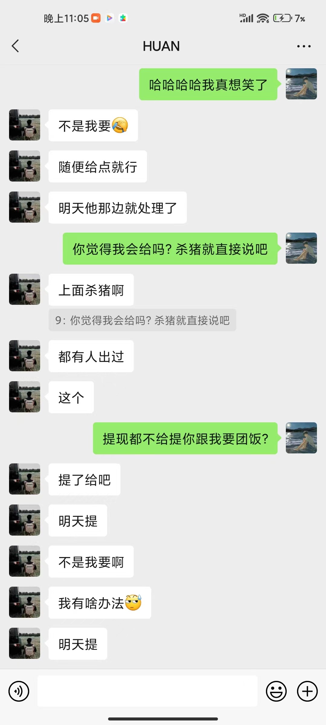 看见你这个要团饭的我就想起来,拉我玩韦德那个,说什么盈利55分,吃我人头,还要我盈利,我梭哈波胆中了,那个逼还让我把输赢明细给他看,我骂了他几句直接给他拉黑了