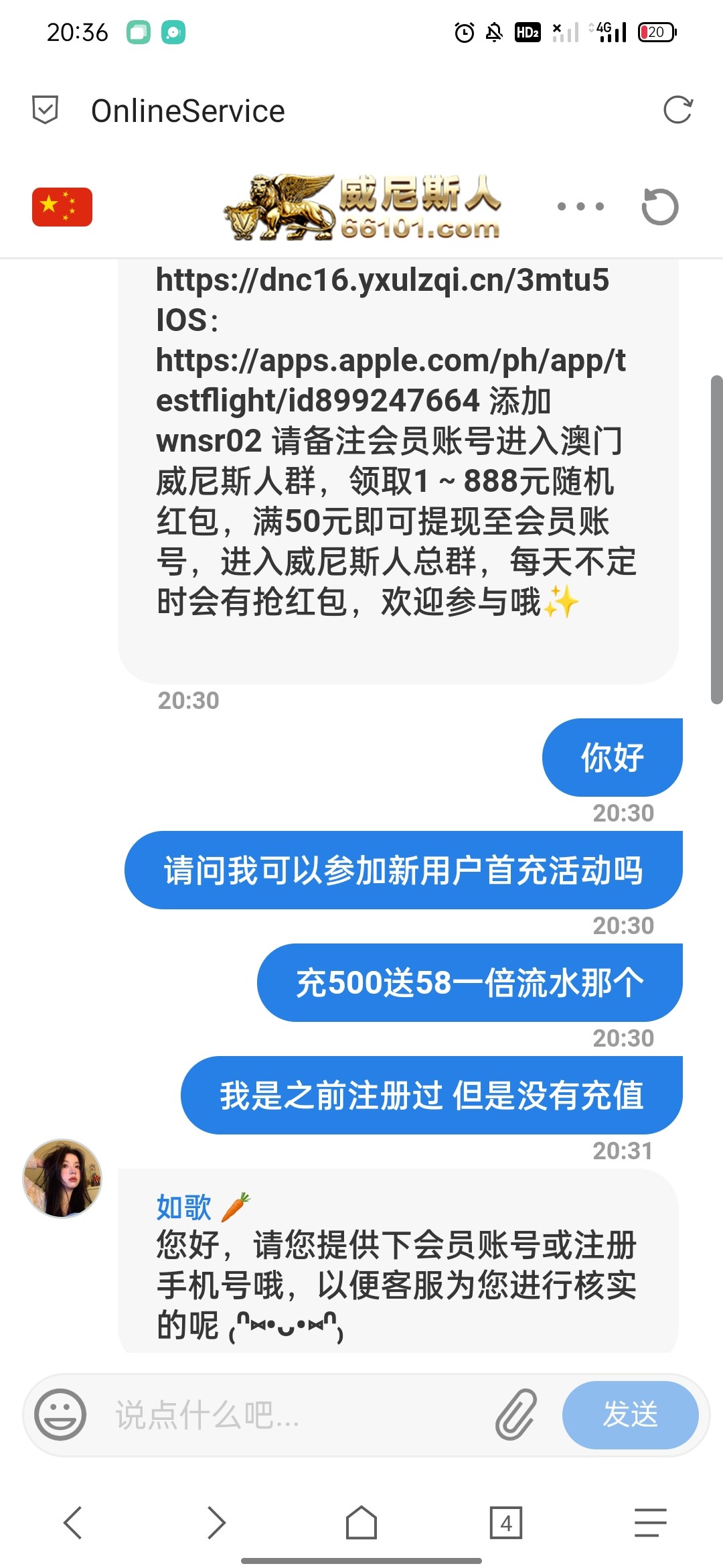 第一天8.8  找狗聊客服送18.8 不知道明天还送不送