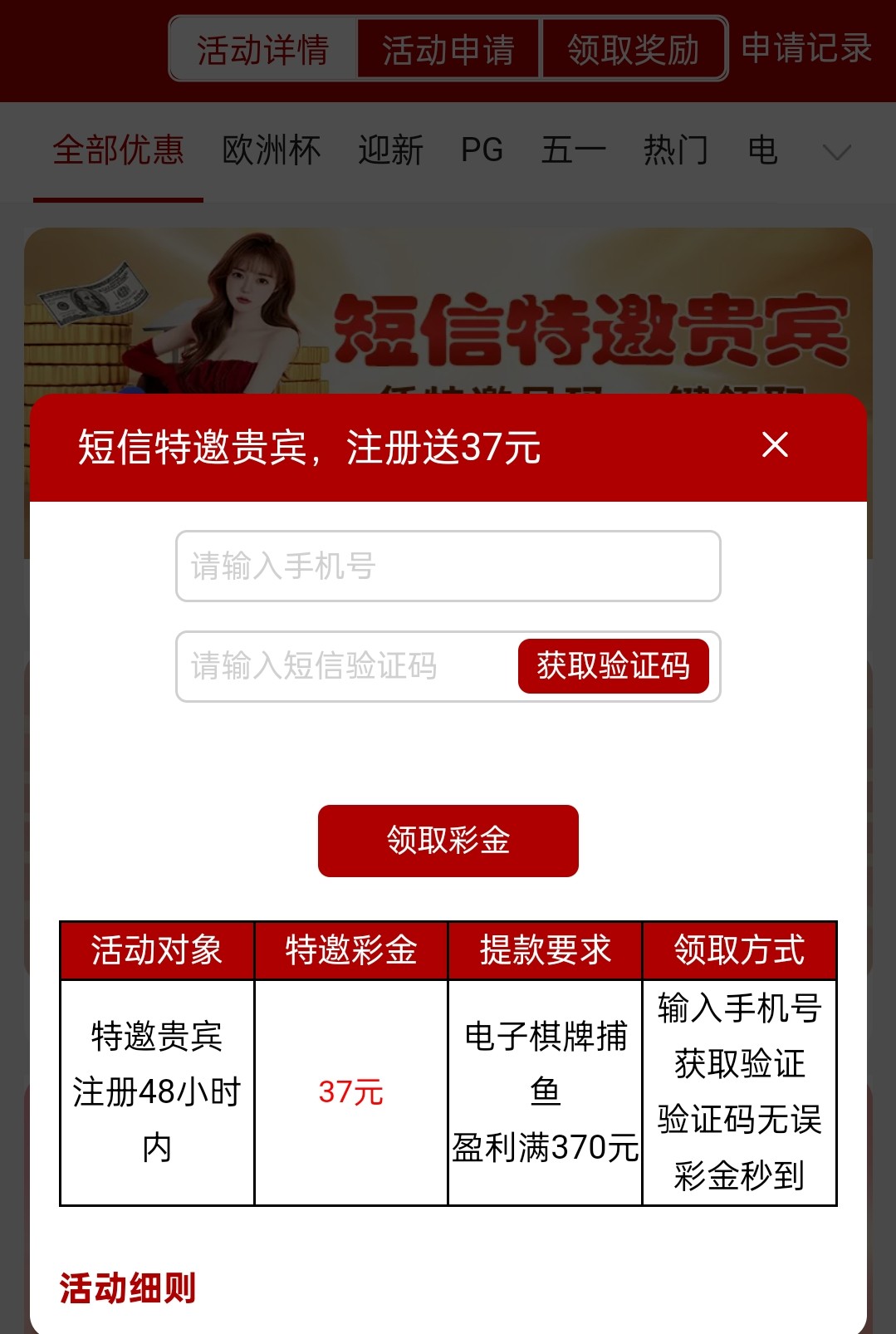 特邀自助申请37 去试试看。下载APP活动跟发短信送37的不冲突。限制游戏盈利到370以上出