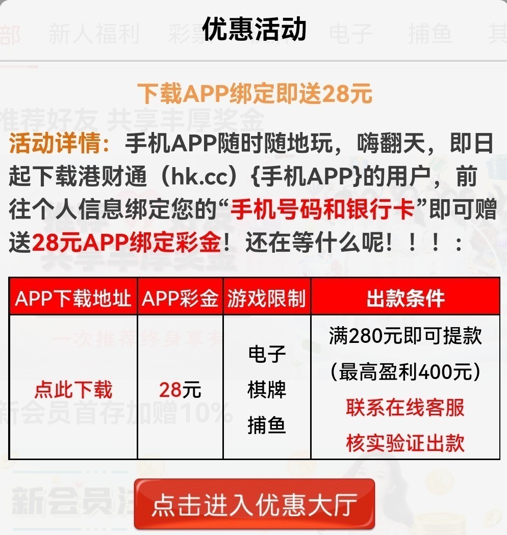 新用户下载APP注册绑卡自助申请28彩金具体查看活动中心