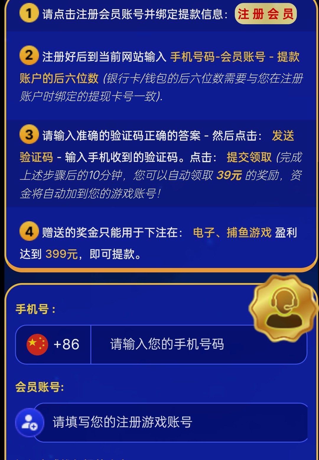短信特邀彩金,39彩金打到399就可以提款,只能玩电子和捕鱼游戏,具体自行查看!