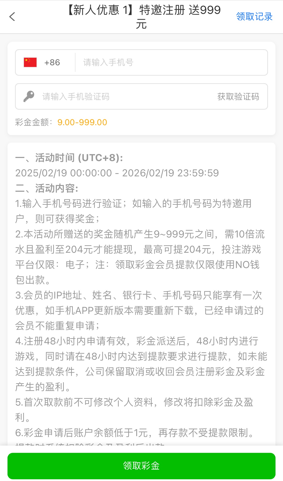 彩金10倍流水,盈利至204才能提现,最高提现204,限电子,只能用NO钱包提现