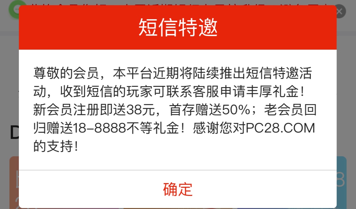 短信特邀送38,之前送过的现在送18,一倍流水没有游戏限制,没玩过的兄弟可以去碰瓷看看,送过38的兄弟上号领18彩金