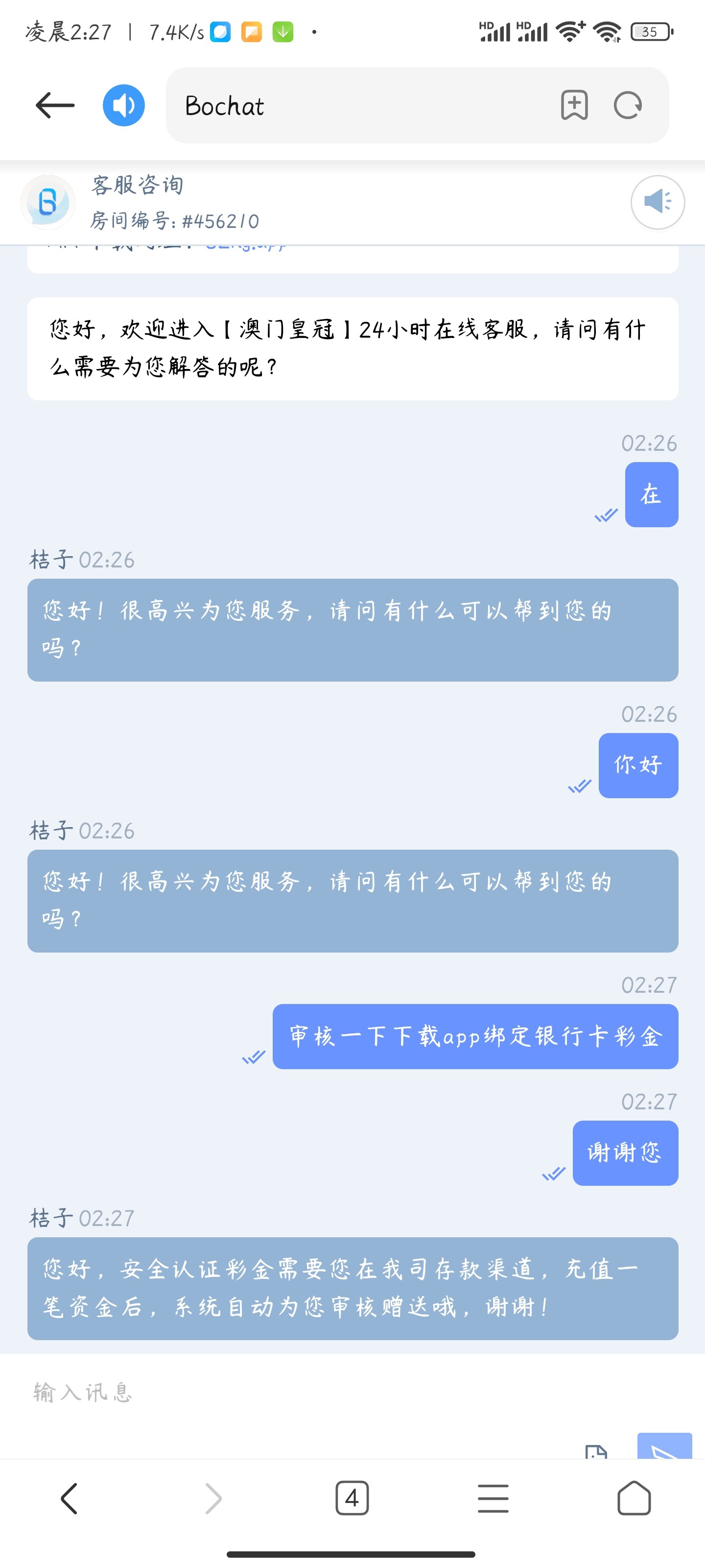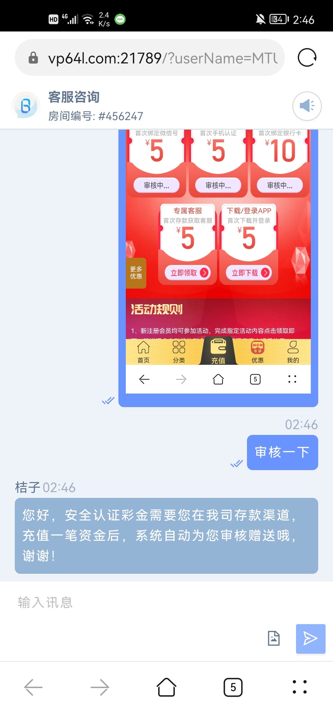 您好,安全认证彩金需要您在我司存款渠道,充值一笔资金后,系统自动为您审核赠送哦,谢谢!换了两个客服都是充值送